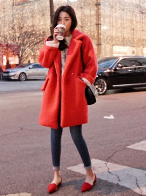 和好姊妹在一起如果怕撞色,穿著紅色的毛絨大衣外套是一個很新鮮的顏色選擇,在所有人之中會相當突出。