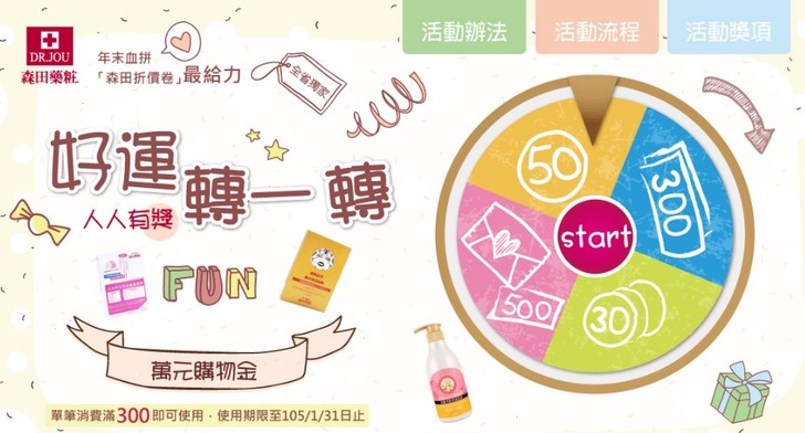 [情報] 森田藥粧轉轉樂送購物金 生活 · aa · 發表於 2015-11-26 18:01 · · 檢舉 列印版 twitter plurk 3.2千閱讀次數 森田藥粧會員看過來~~~ 即日起只要是森田藥粧會員 就可參加好運轉一轉活動 人人都有機會獲得森田折價券唷! http://luckydraw.drmask.com.tw/ 讚 收藏 快速回應 引言回應 登入來回應 header home