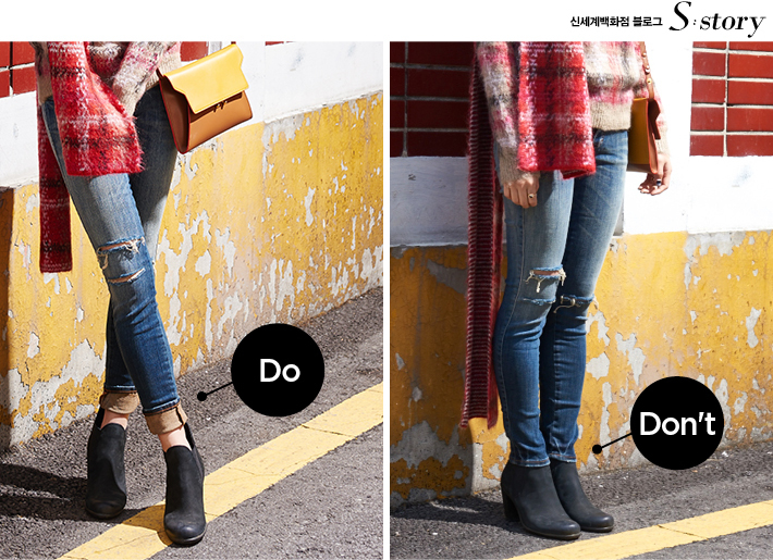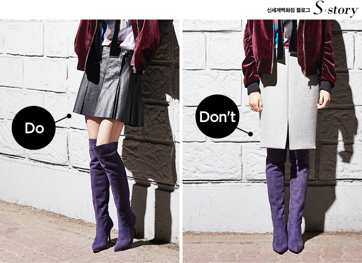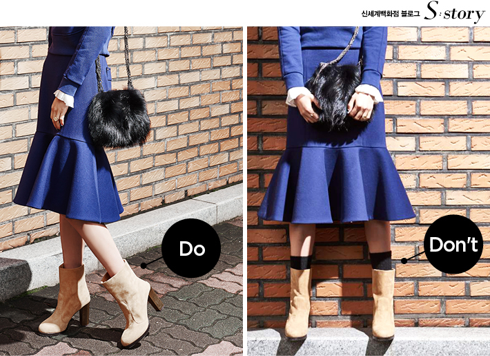 搭配及膝裙時請穿褲襪或能隱藏在靴內的短襪,不要選擇超過靴筒的襪子,以免讓腿看起來更短!