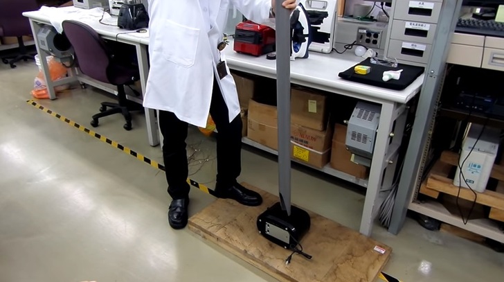 ▼ 電熨斗外殼強度測試部份,將測試物直接摔落在地面,摔落高度為符合一般桌子高度的 90cm,若外殼或接合處出現裂痕、且手指能直接碰觸到內部電熱絲的話就表示實驗失敗。