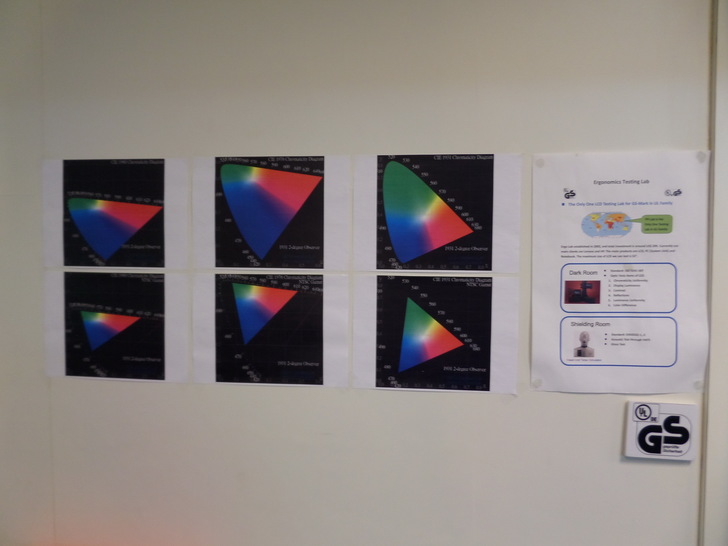 ▼牆上左邊的幾張彩色圖就是國際照明協會色域標準,而右邊的 GS 標誌代表通過德國國家的安全認證。