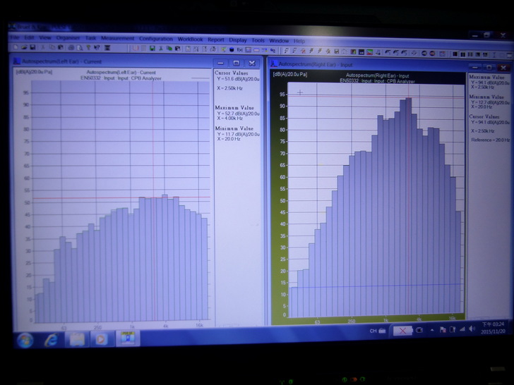 ▼所量測的數值會傳送到一旁的電腦,畫面代表左耳及右耳所聽到聲音轉變成可量測的電子訊號數據。