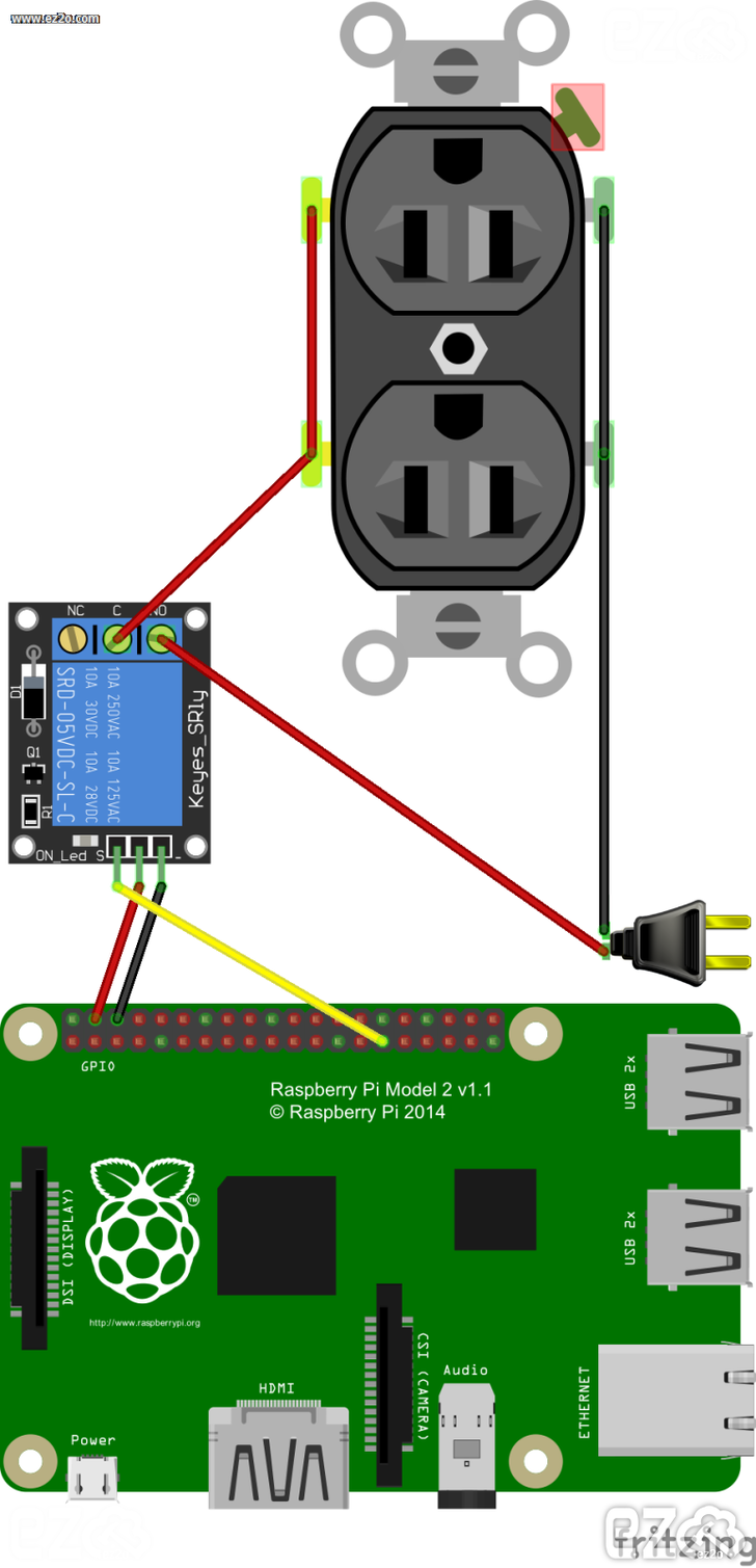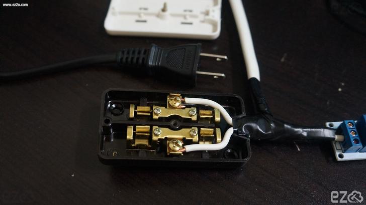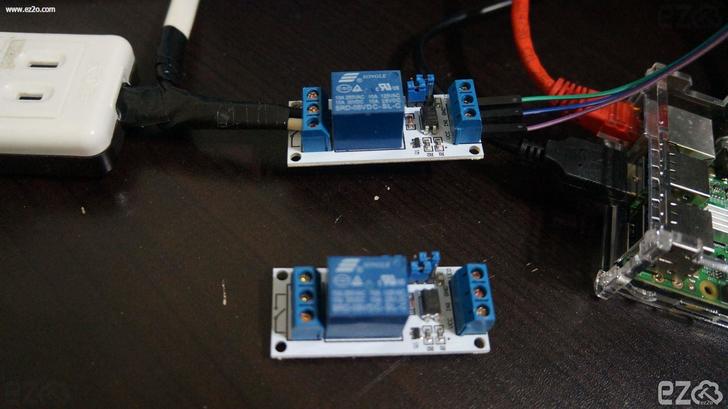 將 繼電器 的線路也接好,左邊接 AC 電源插座,右邊接GPIO。