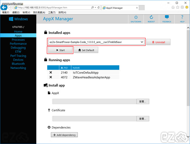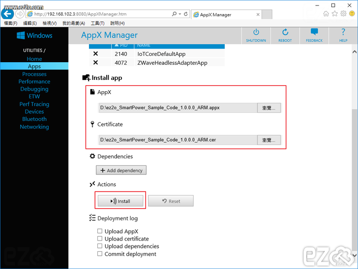 左方選擇 Apps 選項,接下來要安裝軟體,AppX 選項選擇 ez2o_SmartPower_Sample_Code_1.0.0.0_ARM.appx 檔案,Certificate 選擇 ez2o_SmartPower_Sample_Code_1.0.0.0_ARM.cer 檔案,然後按下 Install 按鈕開始安裝。