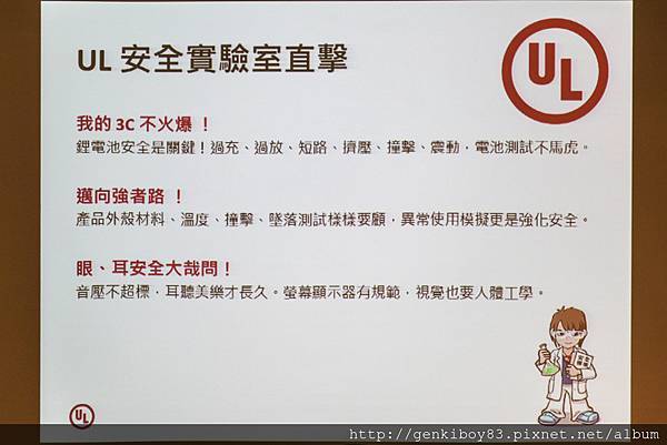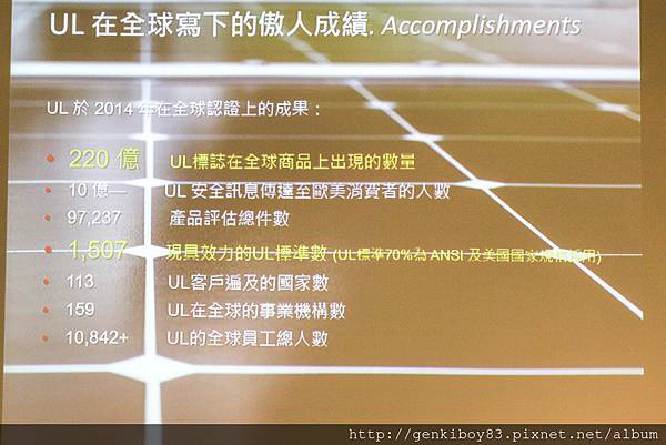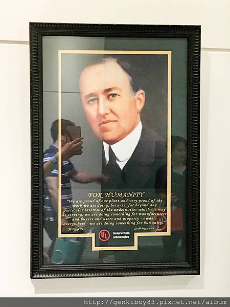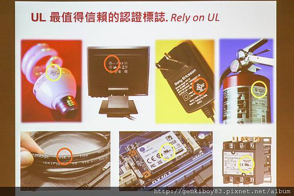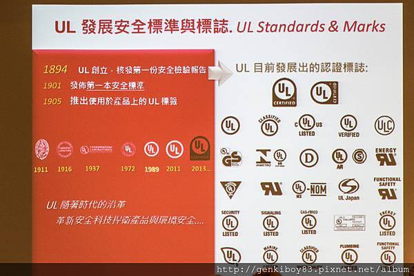 首先先介紹了一下UL的成立原因,1893年為芝加哥的世博會的一場大火燒出了人們對於電力的重視,因此UL的創辦人威廉梅瑞爾就有了正式將電器安全做了一些規範,因此1894年UL實驗室正式成立了,而轉眼間到現在也超過了120年了! 這不經讓我想到這幾年因為有很多的黑心食品陸續出現,大家才開始對食安有了更強烈的需求。