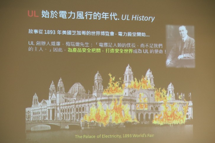 1893年美國的芝加哥辦了電的世界博覽會,就發生了火災,UL創辦人威廉‧梅瑞爾先生去調查為什麼發生火災,