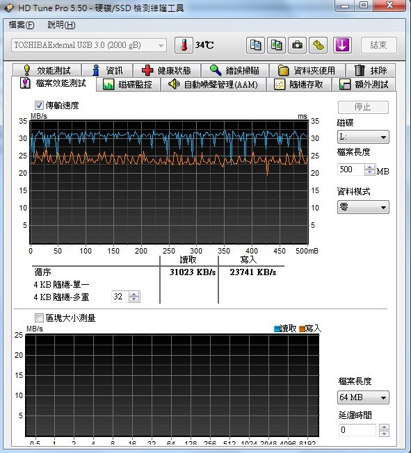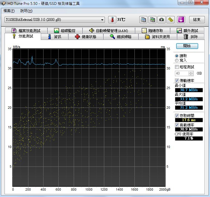 HD Tune Pro5.5測試效能,讀取傳輸上很穩定,起伏不大,平均值在31.2 MB/s,效能水準之上。