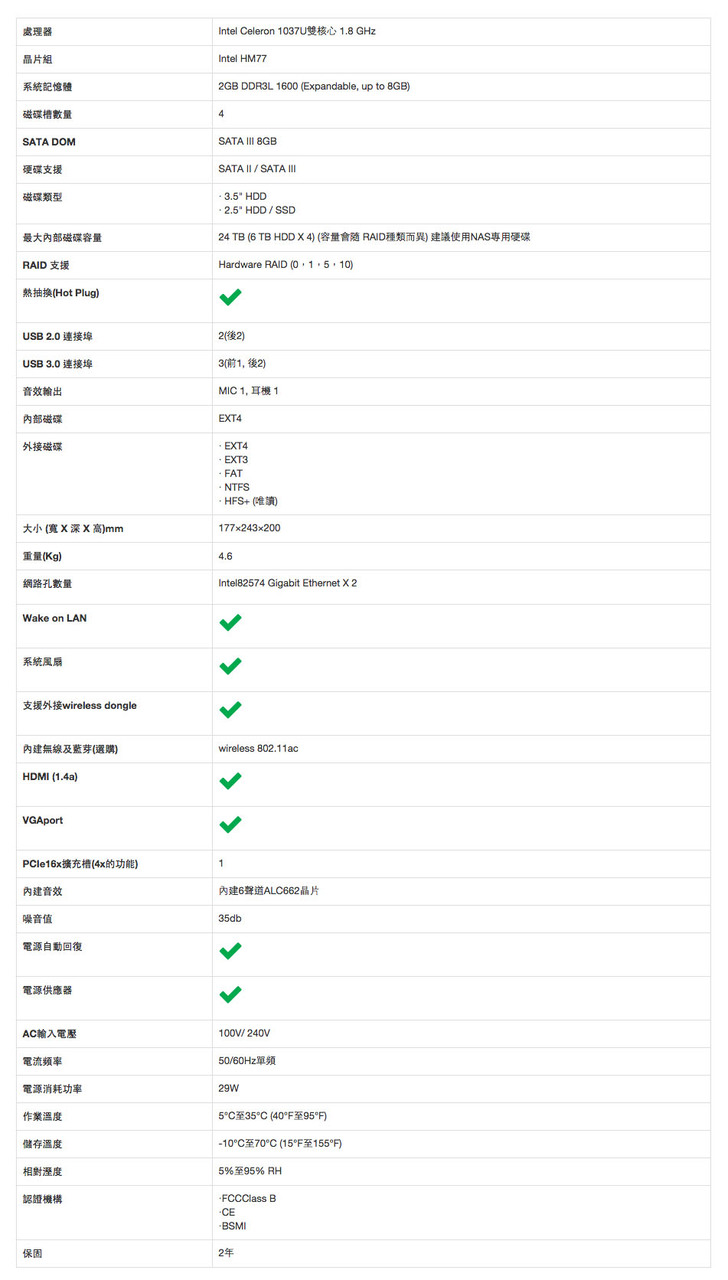 PN-401 是一款 4 Bay 的 NAS,其搭載 Intel Celeron 1037U 雙核心 1.8GHz 處理器,採用 Intel HM77 晶片組,內建 2GB DDR3L 1600記憶體,玩家可以自行擴充到 8GB,內建8GB的DOM。預先搭載作業系統,因此硬碟安裝完成,就可立即使用。在 RAID支援 RAID 0、1、5、10硬體 RAID 功能,有別於一般 NAS 所常用的軟體 RAID。