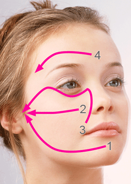 洗完臉擦上保養品之後,依照圖例的方向按摩