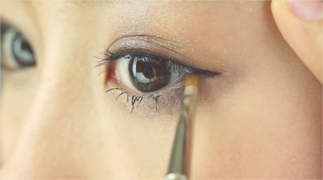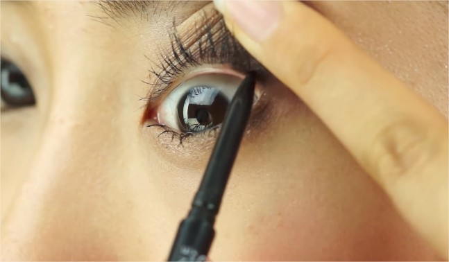 把眼皮輕輕挑起,畫在靠近睫毛根部白白的部分。(其實是皮膚色啦)