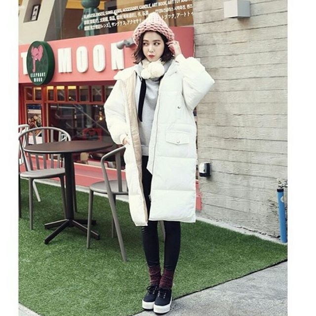 像這樣長版羽絨外套配上窄管褲的話其實就可以很顯瘦。