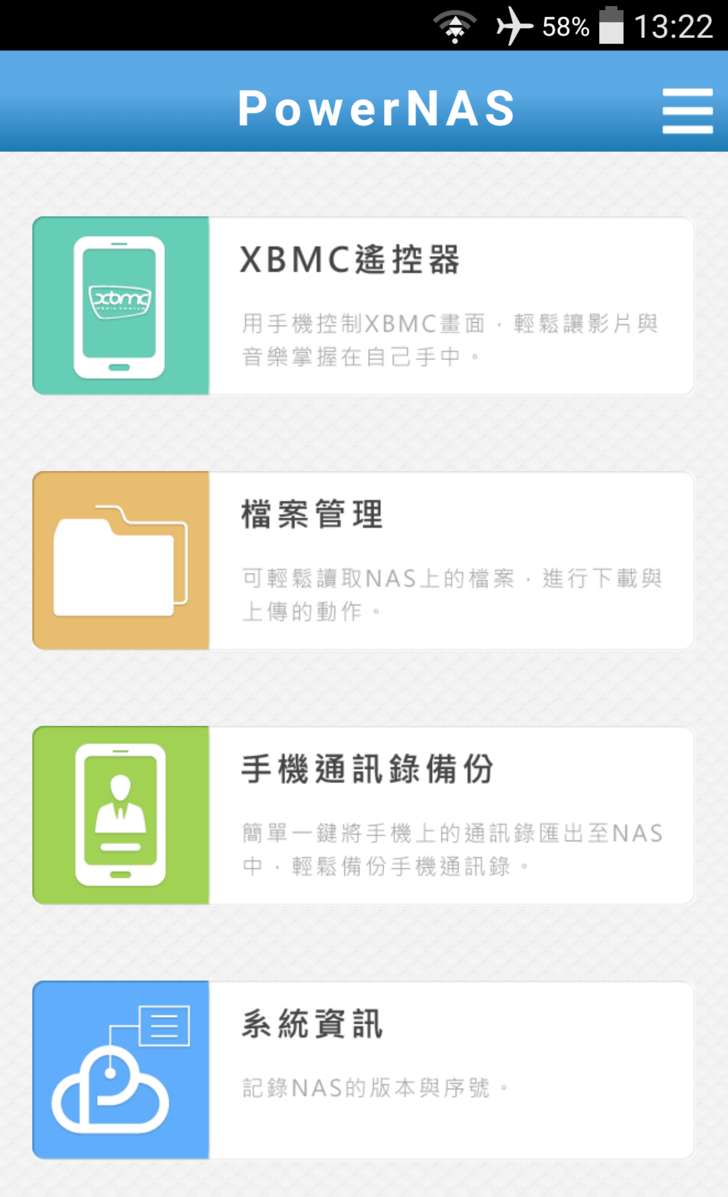 ▲ 硬碟設置好了後,就可進入主頁了,主頁功能非常簡潔,基本該有的功能都有,包括檔案管理、基本設定等,因PN-401有HDMI介面,也可直接當作媒體播放器,使用XBMC軟體。