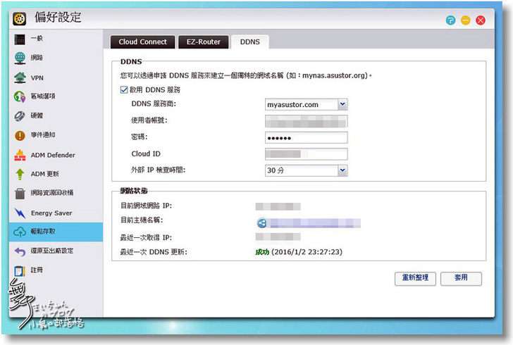 ▲但前置作業是先設定DDNS,我是選擇華碩的myasustor.com網域服務。有了DDNS的幫助,不用固定IP也能輕鬆設定網域名稱。接著 輸入使用者、密碼、Cloud ID後按下《套用》,若看到成功的話就完成第一階段了,如果像我AP有支援UPnP,只要開啟防火墻連接埠就可以了。