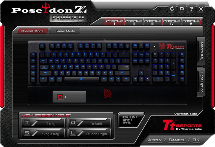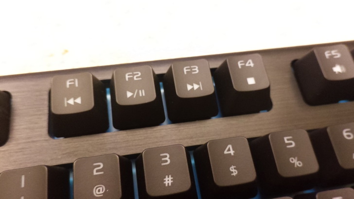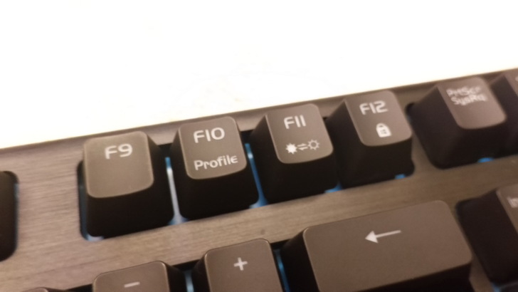 配合FN鍵使用、F10為切換設定檔,一共有5組,且一旁的Profile燈會變顏色以表示目前的設定檔,而F11為控制各背區域性背光發亮切換,一共有5種,F12就是Windows鍵(視窗鍵)鎖住,並會亮著以表示鎖定中(和一般的波賽頓Z有額外Windows鍵鎖住提示燈不同)