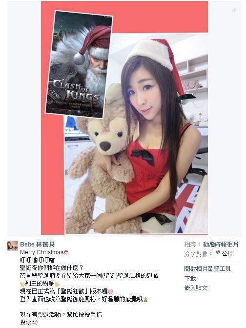 身為列王的小魯蛇,想當然爾今年的耶誕也是要跟聯盟的人一起過 不過在這個寒冷的夜晚總不想去街上被情侶閃爆,所以我決定窩在家裡面,泡杯咖啡然後刷爆那些在過年的外國人 好了,負面能量發完了來看一點妹吧 這位叫林蓓貝的妹子真的蠻可愛的,像這樣看個妹,打個列王也是一天 再過幾天就要跨年了,希望新的一年我也能脫離單身公害的行列阿XD 讚 收藏 快速回應 引言回應 共 2 則回應 1 樓 · 幽靈娃娃車 · 發表於 2015-12-24 20:36 · 檢舉 不需要了,我已經有女朋友了 不過正妹還是要看 讚 引言回應 2 樓 · ruby · 發表於 2015-12-24 20:48 · 檢舉 同樣身為單身男子的我很能體會你的痛苦 幫你補補血 讚 引言回應
