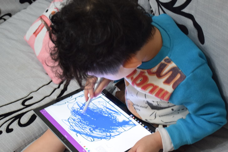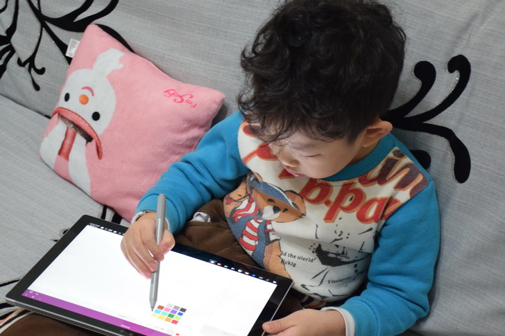 原因就是 Surface Pro 4它那輕薄外型,皮小祐這四歲皮小孩都可以輕鬆拿著