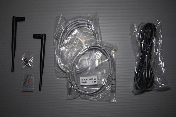 ▼包裝內含 NAS本體、天線兩條、螺絲、乙太網路線兩條、電源線。