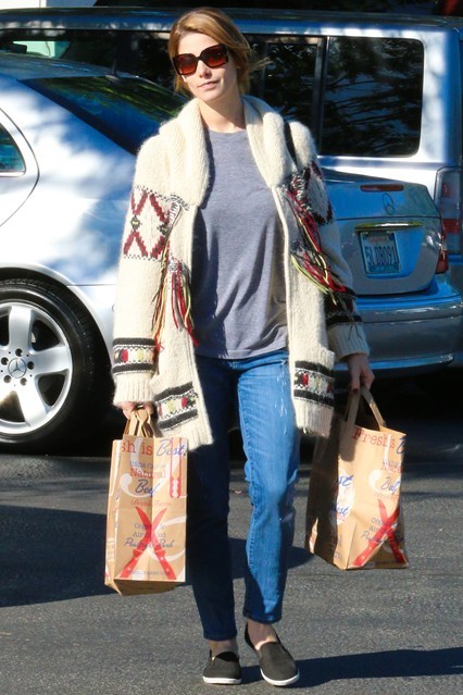 如果你還是很喜歡T恤+牛仔褲的組合,但又怕太過休閒很樸素,可以像艾希莉葛林這樣,把重點放在民族風款式的外套上,身上多了個亮點就不會顯得無趣。