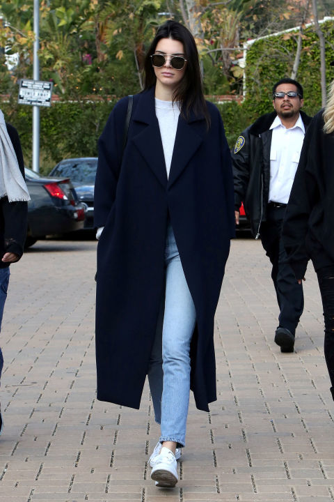 金卡達夏的妹妹坎達爾珍娜一樣選擇顏色相同但深淺不同的穿搭方式,藏青色的長版外套可能會給人沉重的感覺,但淺藍色的單寧褲與白色上衣卻剛好與之作平衡。