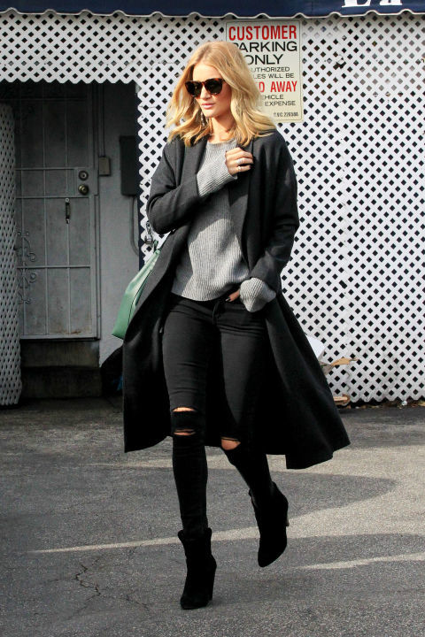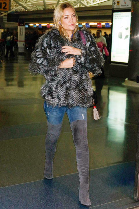 寒冷的冬天可以向凱特哈德森這身穿搭學習,單寧褲加上過膝靴就像穿了兩件褲子一樣保暖,再看看她那身毛茸茸的外套,這就是所謂穿的時尚同時又兼具保暖的最佳範例!當然像我們這種普通老百姓,無法輕易駕馭那樣看起來就是貴婦在穿的外套,可以選擇挺一點的長版大衣搭配起來也是很好看。