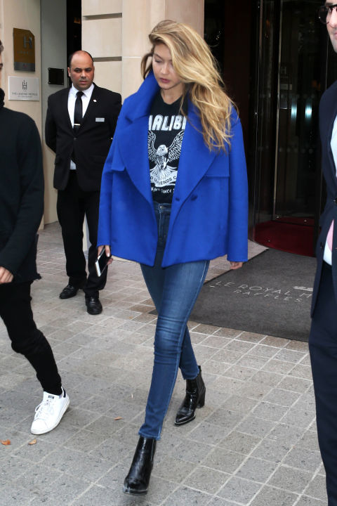 既然單寧褲這麼百搭,其實有時候可以選擇色彩鮮艷一點的單品來配對,像名模吉吉哈蒂德這件偏亮的藍色外套,跟單寧褲搭在一起既不沉悶,又沒有太大的衝突感,而鞋子與上衣則同樣都是黑色,這樣看起來全身其實只有兩個顏色但又很有層次感。
