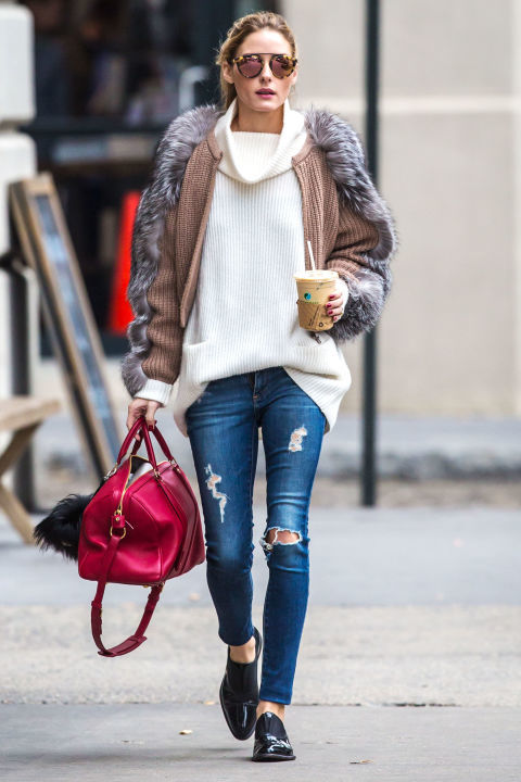 時尚名媛奧莉維亞巴勒莫的穿衣技巧一直都很高超,有毛皮點綴的華麗上衣與隨性的單寧破褲做平衡,像這樣優雅從容又帥氣的穿搭真的不是一般人能輕易模仿得來。