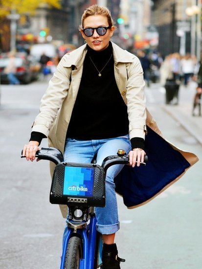 卡莉克勞斯穿著黑色高領毛衣配上淺藍單寧褲,外面再套上一件還可以隨風擺盪的風衣,果然名模就是名模,騎個腳踏車也這麼帥氣!!