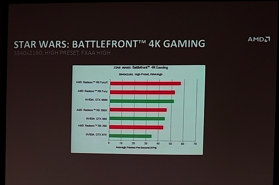 ▲ STAR WARS故事有正邪兩方原力的對決,在運行STAR WARS:Battlefront這套4K GAME中,GPU的對決也有紅綠兩方的對決的,由上圖可以看到紅色的AMD Radeon贏過綠色的Nvidia GTX。