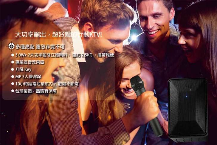 它不僅是個行動KTV,也可聽音樂,當教學擴音、家庭劇院、Party 演唱等,因其可攜式設計,僅重2.5KG,家用外出兩相宜。尤其是其內建超大容量的鋰電池,續航力超過10小時,讓您歡唱不斷電。
