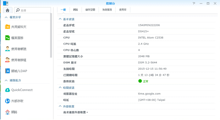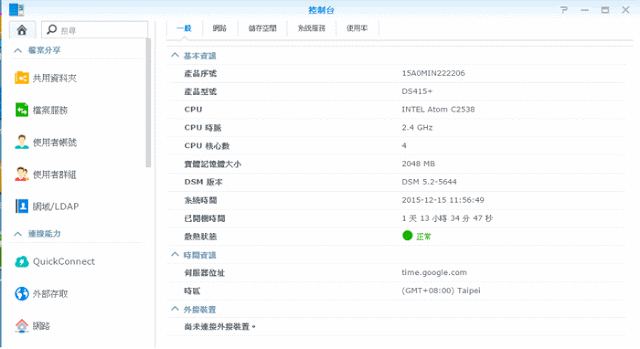 ▼ 由「資訊中心」可以知道 Synology DS415+ NAS是用Intel Atom C2538 2.4 GHz 的四核心 CPU,然後記憶體是 2 GB 。