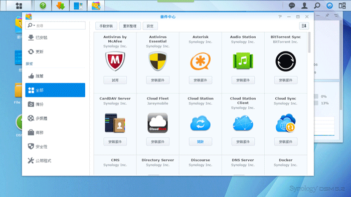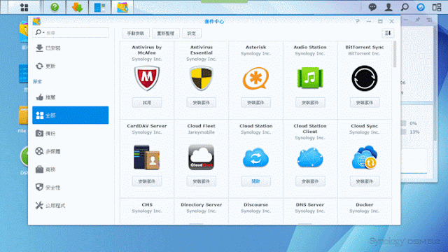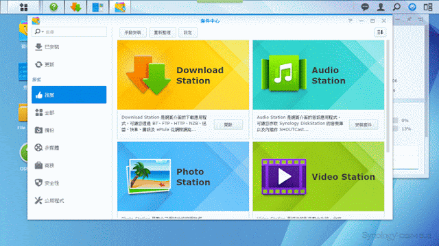 ▼ 如果全部的套件程式讓你不知道該如何選擇,Synology DSM 作業系統的「套件中心」還貼心的幫你分類,讓你可以按照分類找尋自己想要的套件程式。