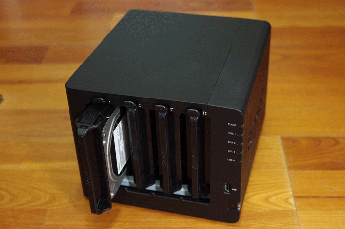 ▼ 打開 Synology DS415+ NAS 的裝飾用蓋子,可以看到放四個硬碟的卡匣和插槽。
