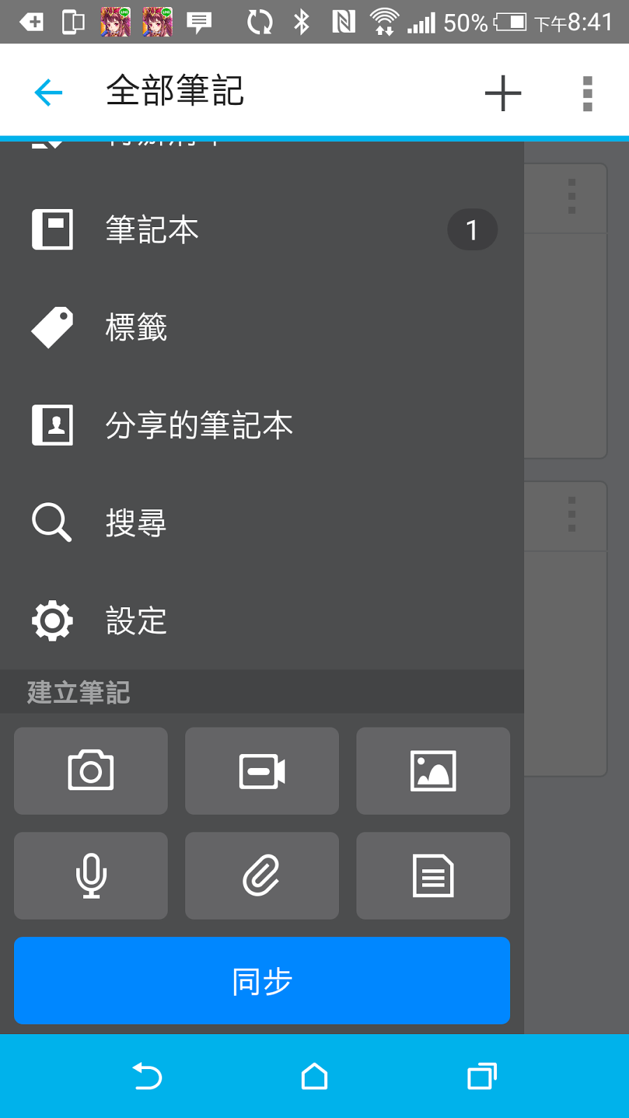 ▼ 開啟 DS note 的功能鍵,然後按同步後會將手機中打的記事上傳到 Synology DS415+ NAS 中。
