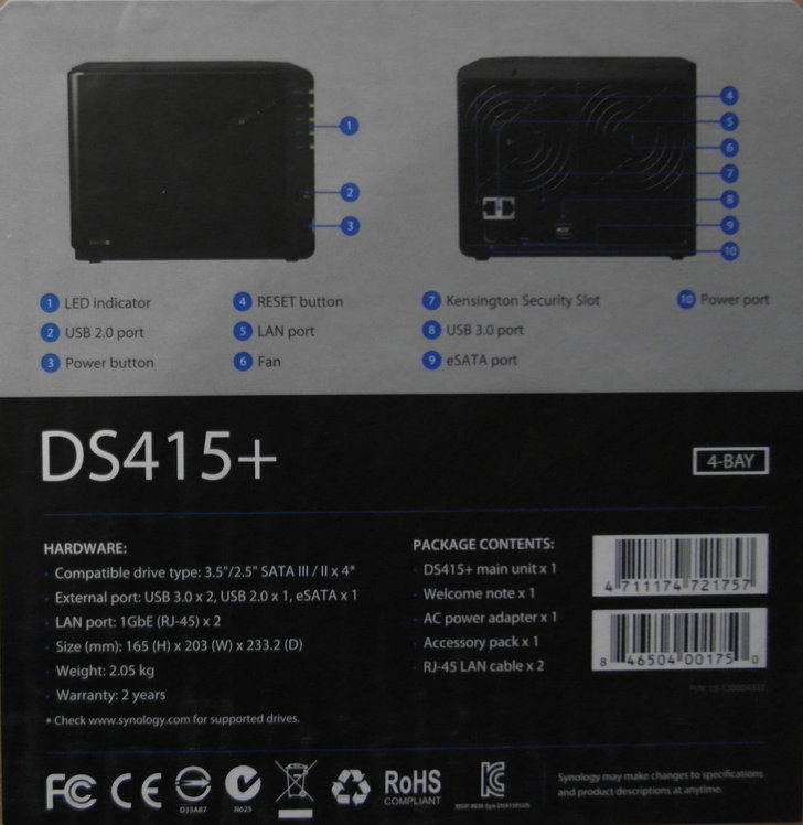 另一面的貼紙則是詳細的標示了DS415+的產品外觀及其功能,還有硬體基本規格和產品內容物。