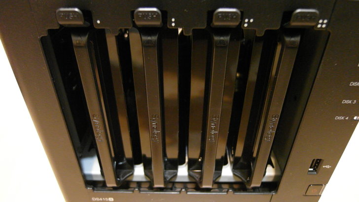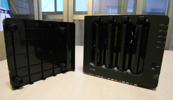 NAS正面的鏡面塑膠外殼其實只要輕輕一扳就拆下了,而內部就是四個抽取式的硬碟托盤,且左下角也有寫出DS415+的型號。