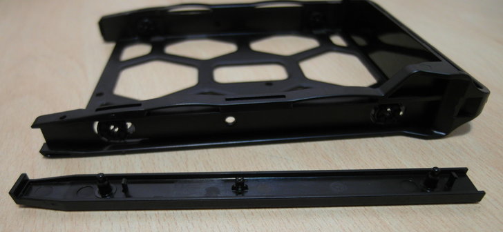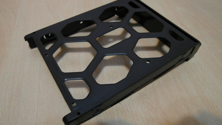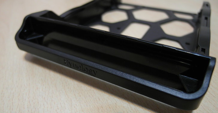 硬碟托盤由於不是金屬材質,因此非常輕;把手的地方有Synology的廠牌字樣。