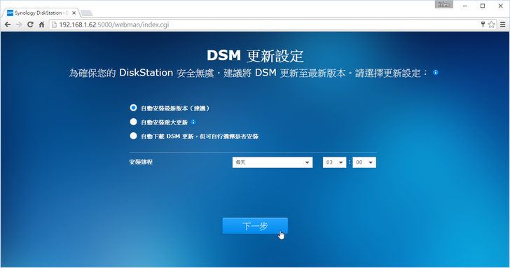 DSM的更新設定,建議選擇"自動安裝最新版本"。