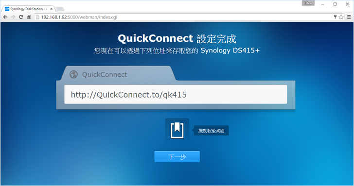 設定好QuickConnect ID後(這裡的範例ID為qk415),我們就可以使用http://QuickkConnect.to/qk415來登入DSM了唷!
