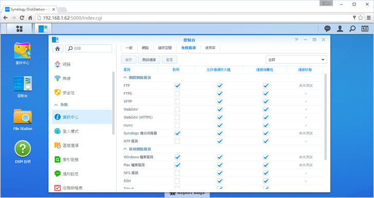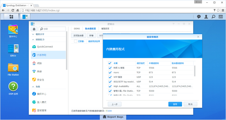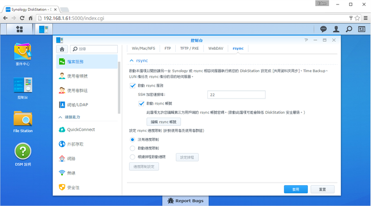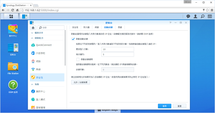 最後在安全性的部分,建議將自訂封鎖的功能開啟,畢竟NAS是對外開放的,被人惡意地嘗試密碼入侵DSM就不好了。