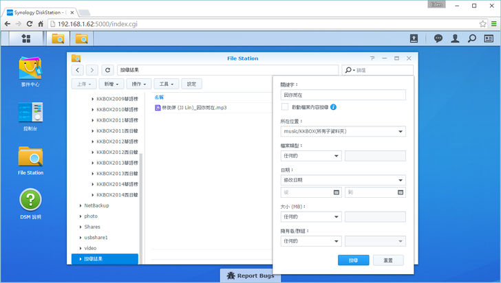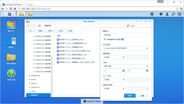 DSM 6.0在檔案搜尋上提供了更有效率的搜尋方式,以下圖為例,如果在音樂資料夾搜尋"因你而在",最多只能找到它的歌名(檔名),搜尋效果不彰。