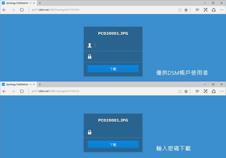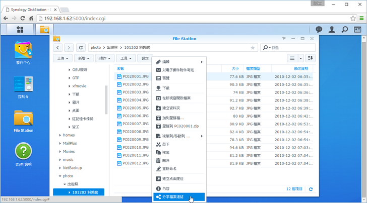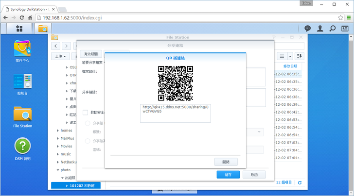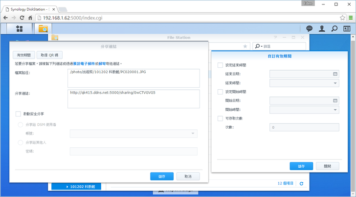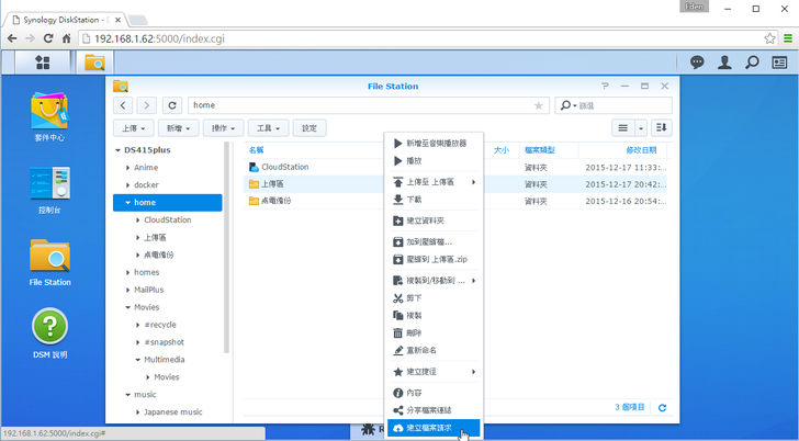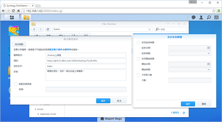 對於沒有DSM帳號的人,Synology很貼心地可以透過"檔案請求"的方式建立專屬網址下載;甚至沒有帳號的人,還能利用專屬網址來上傳檔案,這對於有即時需求的使用者有一個便利快捷的方法來分享檔案呀!使用者只要對檔案點右鍵 → 分享檔案連結即可,該連結甚至可以設定僅供DSM使用者or密碼、檔案開放/結束時間以及存取次數,有點像是在外面看到的免空分享機制。