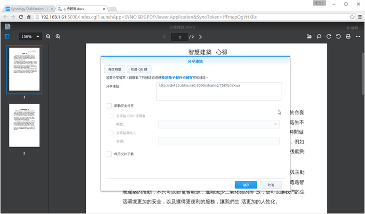 在文件檢視器也可以啟用分享,且能設定安全分享(使用者or密碼)、文件效期,以及使否停用文件下載。