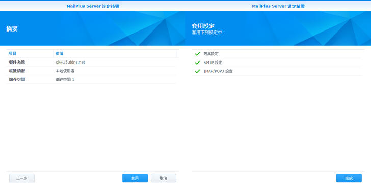 確認完摘要,按一下套用;接著會套用設定,看到三個綠色勾勾後,請按"完成"。