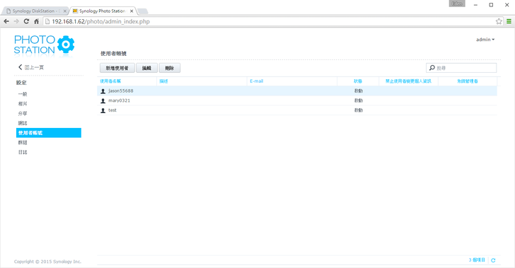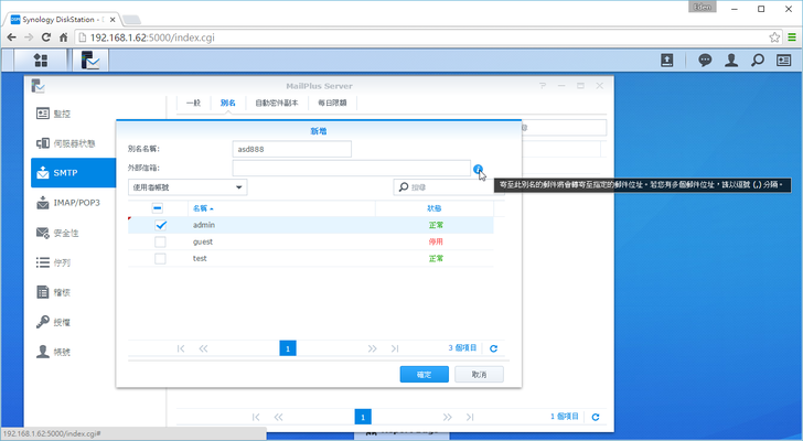 不過像是管理員帳號admin的信箱就會是admin@qk415.ddns.net,因此這裡STMP可以設定自己喜愛的別名(帳號),如asd888@qk415.ddns.net其實就是寄給admin這個使用者,或是設定寄給多名使用者。若是想將郵件轉寄到gmail, yahoo等信箱,可以利用"外部信箱"來設定。