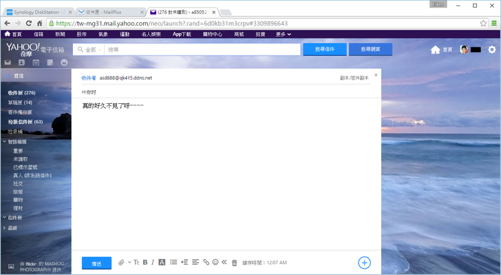 這邊用Yahoo信箱來測試寄信功能,收件者打的是剛剛設定的別名:asd88888@qk415.ddns.net。