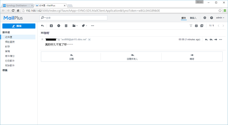 馬上回到Synology的專屬信箱套件 — MailPlus,可以看到剛剛寄出的信件唷!但是家中的固定IP正在架另一台NAS,這台DS415+是用浮動IP架設的,而浮動IP容易被gmail等郵件伺服器擋住信件,因此這邊就不測試MailPlus的寄信功能。