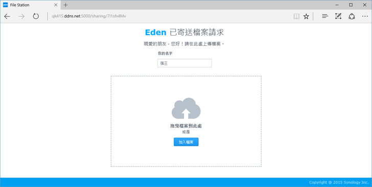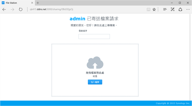 其他人拿到網址後,就可以上傳檔案,輸入的名字則會成為上傳後檔案資料夾的名稱。