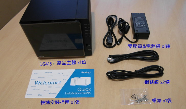 下圖為DS415+的產品內容物,有產品主體一台、變壓器和電源線一組、網路線兩條、螺絲一袋,以及快速安裝指南一張。
