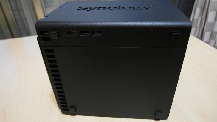 DS415+的側面兩邊都是印著大大的Synology商標,且此商標有做洞洞線條的通風散熱設計。