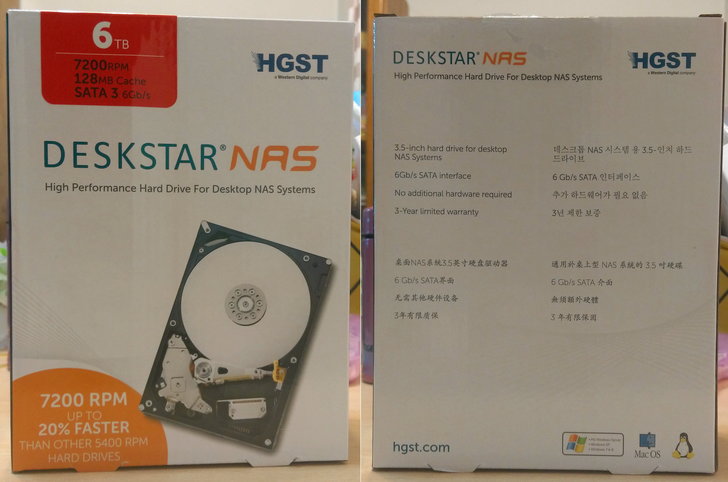 HGST Deskstar 6TB NAS專用碟擁有7,200RPM高轉速、1M MTBF(平均無故障運行小時,比起一般桌上型硬碟的80萬小時MTBF高出許多),以及旋轉震動傳感器(能夠感應硬碟震動,並加以修正磁頭讀寫功能,從而保持讀寫效率)。